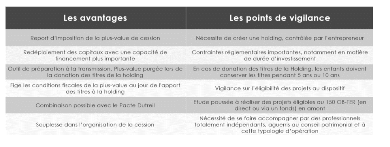 Non. C’est un outil permettant de diversifier son patrimoine. L’essence du mécanisme est de favoriser le redéploiement des capitaux des entrepreneurs dans l’économie réelle. Ces derniers devant réinvestir au moins 60 % des sommes générées par la vente. Le législateur dresse d’ailleurs une liste précise des activités éligibles au réemploi. Des projets qui présentent par nature un risque en capital. C’est pour cette raison que l’entrepreneur doit les analyser en amont, avec une grande rigueur, et vérifier leur éligibilité. Une étape indispensable, car l’intérêt de l’opération repose en très grande partie sur la rentabilité des projets sur lesquels la holding va investir.